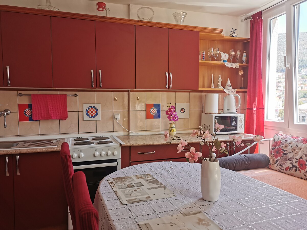 Nuestro apartamento es un acogedor estudio de 25 metros cuadrados (237 pies cuadrados). El apartamento tiene 1 dormitorio con 1 cama doble que en realidad son dos camas individuales, una justo al lado de la otra. Cocina pequeña (2 placas calefactoras) con mesa de comedor. Baño con ducha/ en suite/WC. Terraza PRIVADA muy grande (100 metros cuadrados o 1075 pies cuadrados) reservada solo para ti, que ofrece vistas espectaculares del mar, el casco antiguo, la isla de Lokrum. Para los huéspedes que llegan con auto, el estacionamiento se incluye de forma gratuita en nuestro lugar de estacionamiento privado.