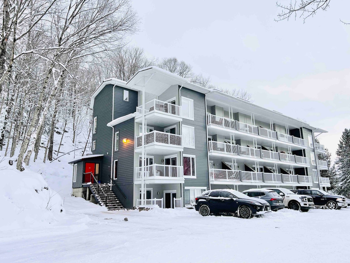 Apartamento tipo estudio con balcón privado, rodeado de bosque. Excelente ubicación, a solo 4 km de Ski Hill, cerca del lago Mercier, el Petit Train du Nord Trail para esquí de fondo, restaurantes, cafeterías, bares, tiendas de comestibles, spa escandinavo. Cocina totalmente equipada, mesa de comedor para 2, aparcamiento gratuito, wifi de alta velocidad, TV inteligente con Netflix y Youtube, cómoda cama tamaño queen con edredón. La piscina y el spa están cerrados por temporada. Parada de autobús urbano gratuita a solo 200 metros de distancia. NO fumar, NO mascotas CITQ301061