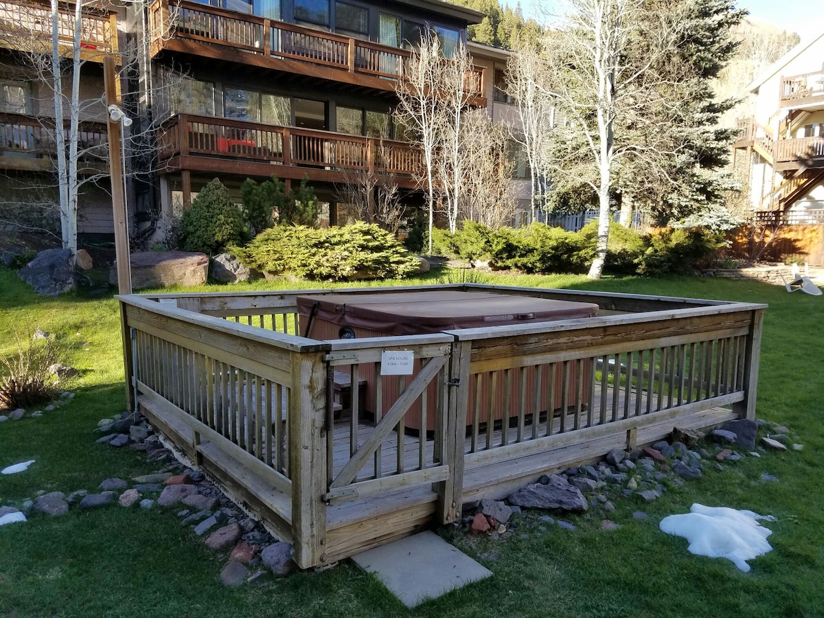 Overlook the river for this Ski in/Ski Out 1 bedroom Condo! New Hot Tub/pool This home boasts one of the best locations in town. 10 min walk to festival grounds entrance. 30 second walk to the river trail. 5 min walk to gondola/slopes or downtown. Amazing views from patio. Its a very quick walk to enjoy all the local eats, galleries, shops and music festivals. Park your car and walk everywhere! New Hot Tub is open! #00652