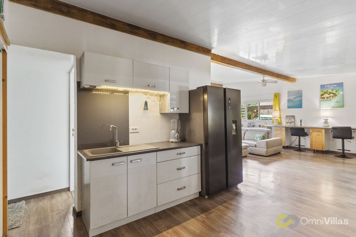 Junto a la orilla, se encuentra un bungalow con un baño, un acogedor escritorio y una terraza de madera adornada con un pequeño salón al aire libre, una mesa, tumbonas, una hamaca, kayaks y una barbacoa. Además, un JACUZZI compartido frente a la playa. Una cocina equipada te espera en la terraza cubierta. Ideal para relajarse, explorar Moorea, remar para conocer delfines con los kayaks, senderismo o simplemente saborear el arte.