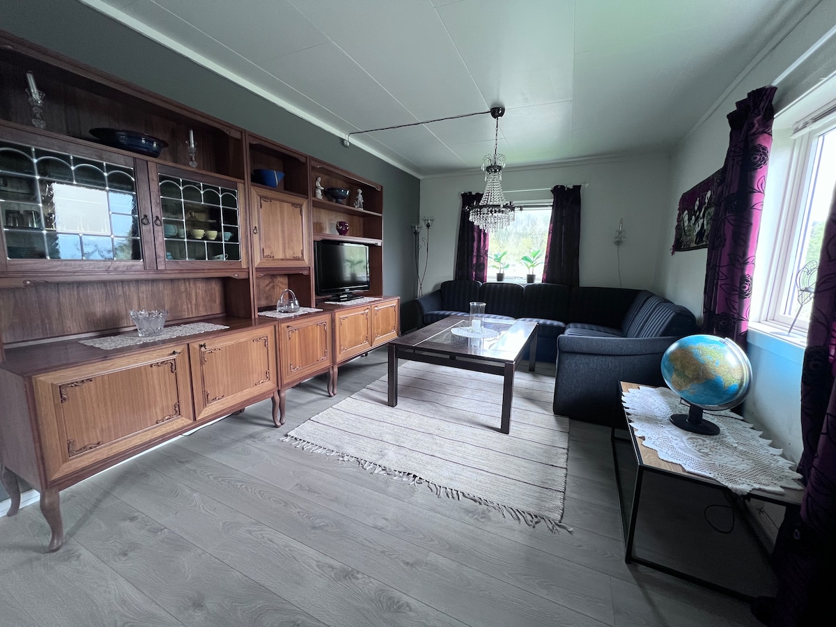 Luminoso y bonito departamento con cocina y baño nuevos. Cocina bien equipada y estufa de leña en la sala de estar. La propiedad se encuentra con fácil acceso desde la carretera, lugar tranquilo con vistas a los campos y las montañas. Amplio patio para cenas, juegos, aparcamiento y similares. Está a pocos pasos del mar, donde puedes alquilar un barco y tener acceso a áreas de baño. El recorrido comienza justo en la puerta principal. Funciona bien para familias, parejas y amigos.