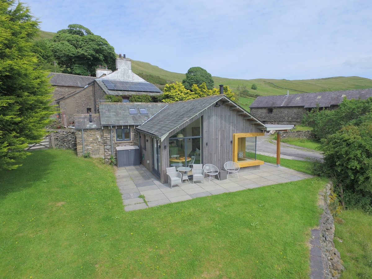 A spectacular modern new build open-plan cottage incorporating features of an original 19th century stables offering spectacular uninterrupted panoramic views over Kentmere towards Windermere and the Langdales from its elevated farm location. An excellent base for walking, cycling or touring in the Lake District National Park or the Yorkshire Dales National Park or for just relaxing in delightful surroundings both within the property or in its open-aspect garden