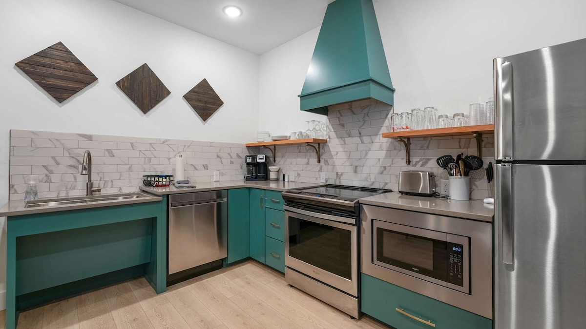 A refined, western-inspired retreat featuring an original 1932 stone fireplace, warm brass accents, and luxe furnishings. The king master suite opens onto a private walk-out balcony with serene lake views. The cozy living area includes a memory-foam Murphy bed and stylish leather seating. The fully stocked kitchen, complete with pantry and round marble dining table, creates a perfect setting for intimate meals or morning coffee.