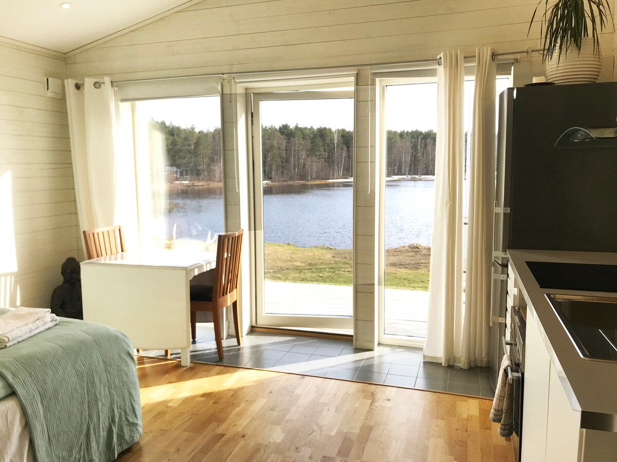 A lovely quaint top floor apartment with beautiful sunsets, double bed plus a sofa bed, kitchen and dining area, shower and bathroor, flatscreen curve TV and fiber internet access. Located a 15 minute walk from the city center across or around the beautiful Skurholms Lake. Close by you have forest walks, the ice road, cross country and down hill skiing, bath house, as well as easy access to a new grocery store, as well as restaurants and entertainment in the city center.