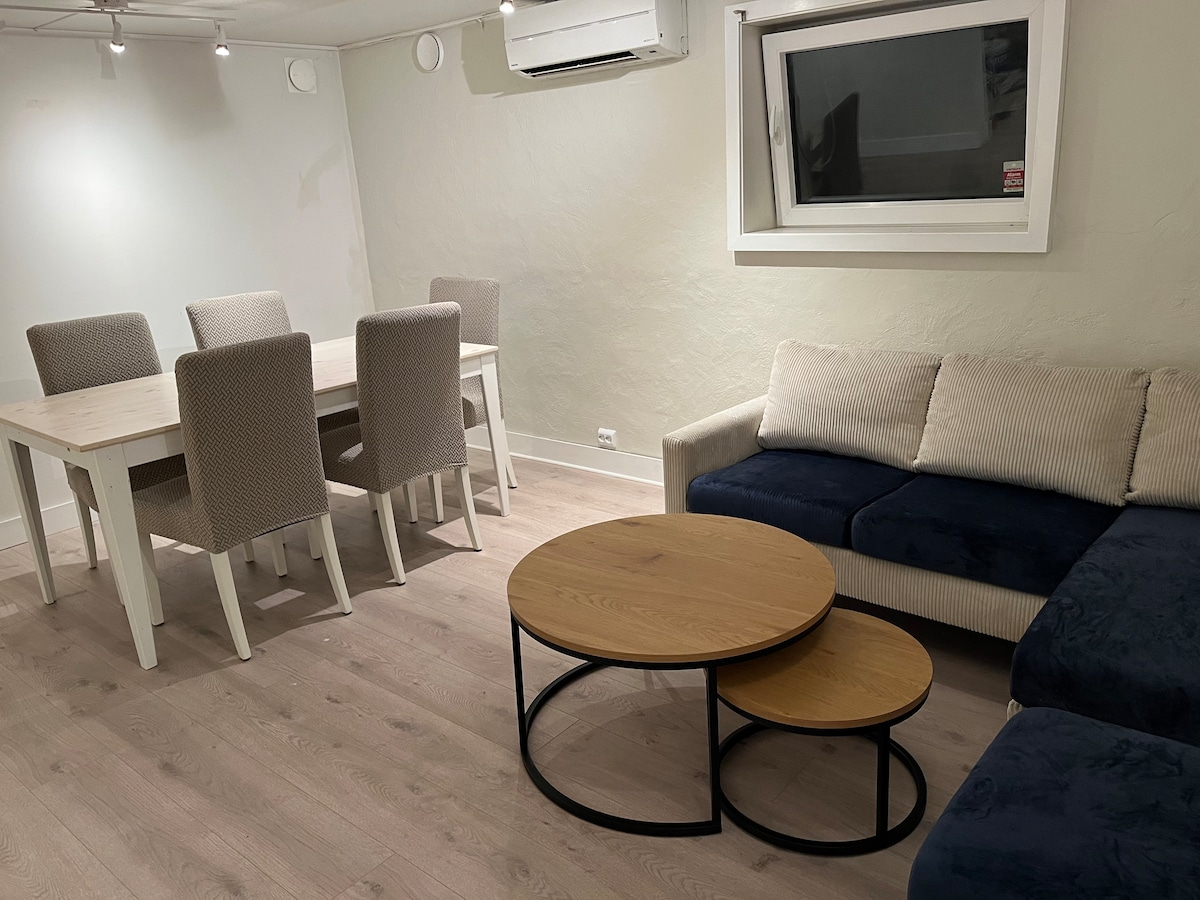 Un apartamento grande y cómodo cerca del centro de Kristiansand. El apartamento tiene cocina, dos dormitorios y un baño; se adapta a una familia y estancias más largas. Cuenta con dos balcones y jardín accesible desde el dormitorio principal y la sala de estar. La cocina es de diseño escandinavo moderno con comedor para seis personas y tiene una silla para niños pequeños. Gran sala de estar. Baño accesible desde el pasillo y uno de los dos dormitorios. Wifi . Aparcamiento para cuatro coches y posibilidad de carga de vehículos eléctricos.