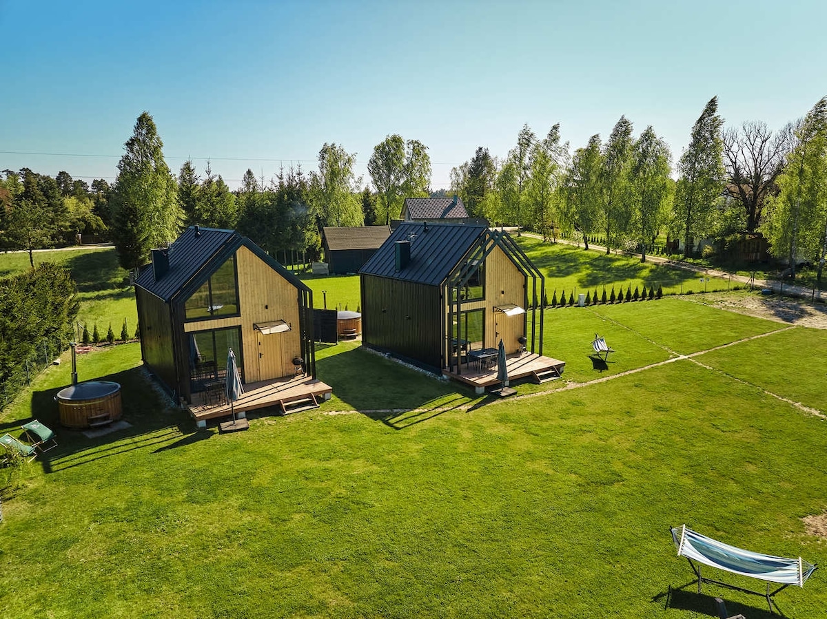 Oferujemy kameralne domki w stylu nowoczesnej stodoły na Mazurach. W niedalekiej odległości do jeziora Mielno (300m). Z tarasami z widokiem na las. Każdy z obiektów posiada prywatną balię z jacuzzi. Domek mieści dwie sypialnie dwuosobowe umieszczone na antresoli. Na dole znajduje się salon z aneksem kuchennym (TV z Netflix, kominek). Kuchnia jest w pełni wyposażona (lodówka, zamrażarka, płyta elektryczna, zmywarka, piekarnik, czajnik elektryczny, ekspres do kawy).