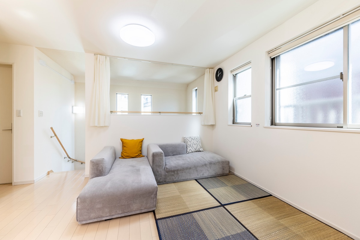 Una casa recién decorada, muy acogedora y cómoda. Hay 3 dormitorios grandes disponibles, hasta para 8 personas. La casa es una propiedad legal con una licencia de operación emitida por el gobierno japonés. Puedes quedarte en la casa sin preocuparte por infringir una ley en Japón. El acceso desde el aeropuerto de Haneda también es muy conveniente, ya que está a 5 minutos a pie de la estación de Keikyu Kamata. 【Tamaño】 72 metros cuadrados + loft grande + balcón en la azotea
