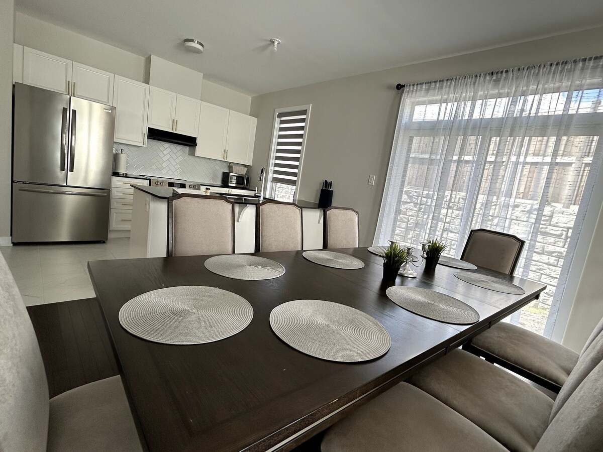Lujosa casa adosada de 4 dormitorios y 2,5 baños con camas dobles/queen, puede alojar hasta 8 personas cómodamente. Nueva construcción de menos de 3 años, sótano terminado con un enorme televisor de 85 pulgadas con cine en casa 5.1 e iluminación adaptable (Netflix/Disney plus/Prime/Apple). Gimnasio completo en casa y cinta de correr. Wifi gratuito y más de 40 electrodomésticos inteligentes disponibles para su uso. Acogedora casa ubicada en la nueva zona de Barrhaven, a 5 minutos de la carretera y de tiendas de comestibles y servicios. A 20 minutos del centro de Ottawa a través del acceso a la carretera.