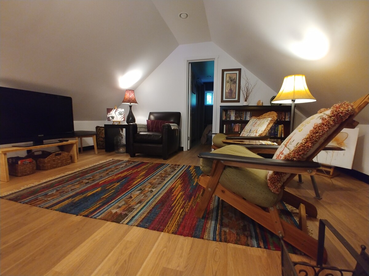 ¡Bienvenido a tu santuario privado! Acogedor apartamento tipo loft en medio de Diane's Gardens. Aparcamiento y entrada privados, patio con chimenea. Cocina totalmente equipada, dormitorio separado y baño completo. Ambiente sereno con arroyo balbuceante y pintoresco estanque. Jardines meticulosamente cuidados con múltiples patios. Relájate con un libro, una taza de café o tus propios pensamientos. Vuelve a conectar con la naturaleza, relájate y revitalízate. Imagínate acurrucándote junto al fuego crepitante bajo el cielo estrellado, saboreando momentos de tranquilidad.