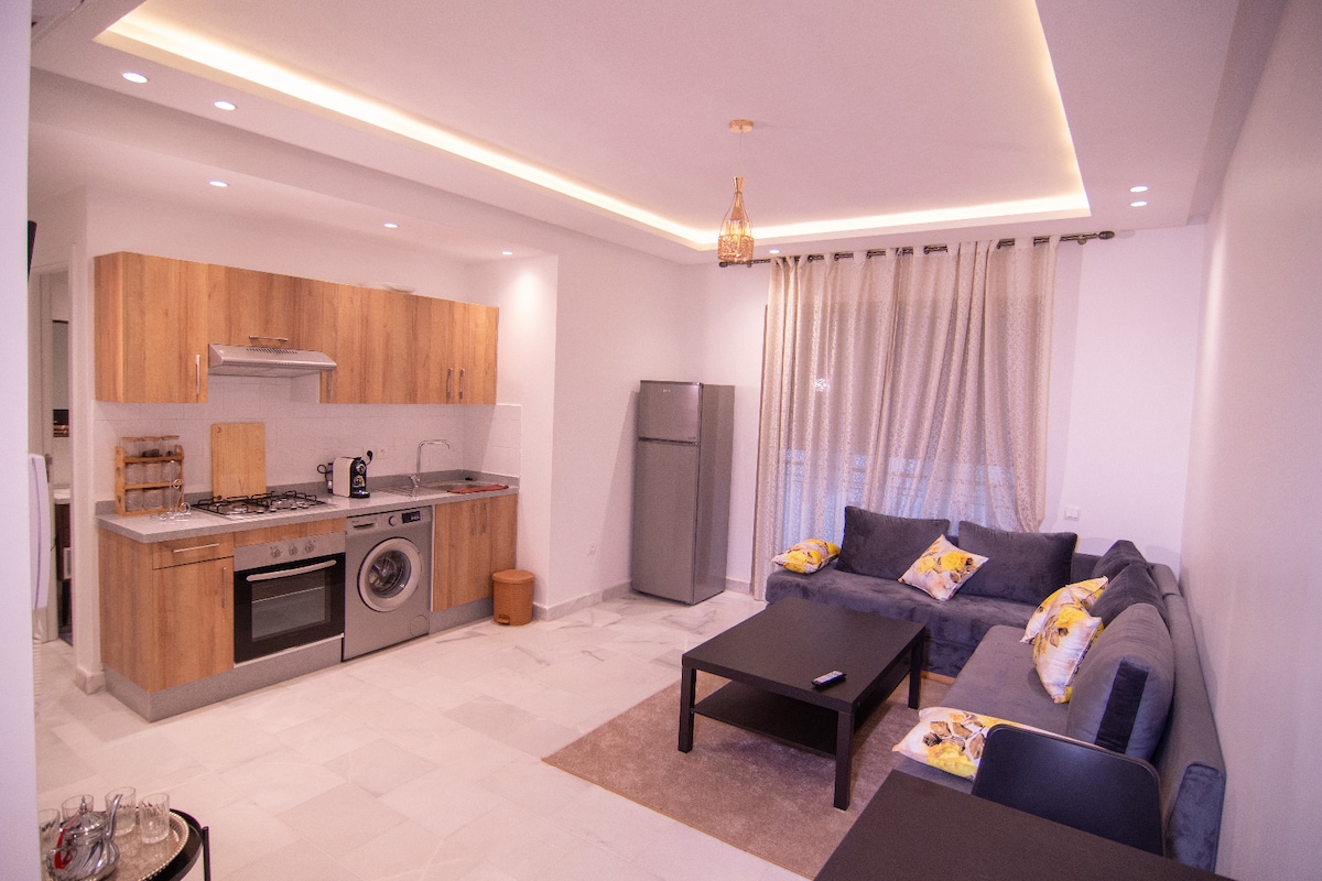 Estancia luminosa en TAJ LIVING PREMIUM, residencia segura y ajardinada en Nouaceur, ideal antes o después de un vuelo a Mohammed V. El aeropuerto es accesible rápidamente en unos 5–8 minutos, conveniente para llegadas tardías y salidas tempranas. El salón ofrece una buena altura de techo con grandes sofás, TV y wifi. La cocina está totalmente equipada para estancias cómodas. El dormitorio separado ofrece una cama doble y espacio de almacenamiento, complementado por un baño moderno.