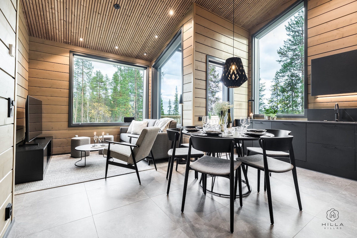 Villa KaLi A ofrece alojamiento vacacional de alta calidad en Levi. Los grandes ventanales de la villa dejan entrar la naturaleza en el salón y se abren a un hermoso paisaje forestal. En la terraza protegida, puedes relajarte en la bañera de hidromasaje en tu propia paz, y en el interior encontrarás un entorno moderno y lujoso tanto para las escapadas diarias como para unas vacaciones más largas. Esta lana combina a la perfección la comodidad con estilo y la paz de la naturaleza de Laponia. Tarifa de bañera de hidromasaje 100 € por reserva.