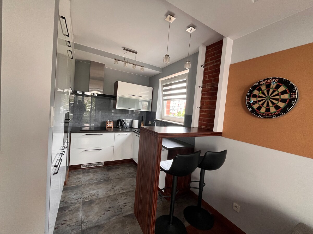 Este apartamento con acabados y muebles modernos se encuentra en un complejo seguro en el corazón de la ciudad de Lodz. Amplia sala de estar con cómodo sofá, mesa y 4 sillas, mueble de TV y TV de 55 pulgadas con Play Station para jugar a juegos como los de la foto y con aplicaciones como Netflix, Apple TV, Max y Prime. Está conectada a una cocina totalmente equipada. Dormitorio principal con cama tamaño queen. Dormitorio de invitados: cama doble. Una plaza de aparcamiento está dedicada para ti, dentro de la zona segura, junto al edificio.