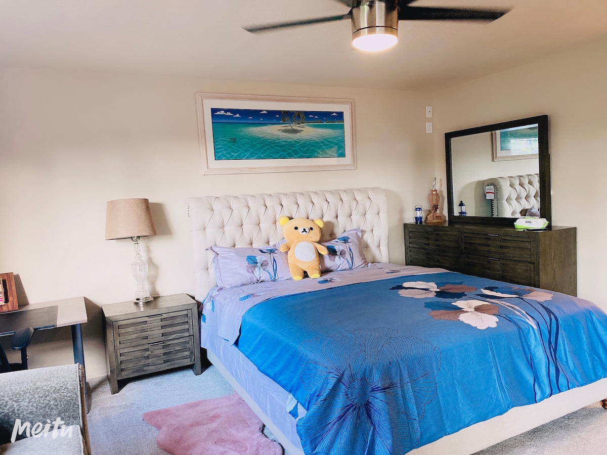 Cerca de SDSU, dormitorio principal grande y acogedor con baño en la habitación. Mesa de escritorio, wifi, televisión y aire acondicionado central. (Habitación 1)