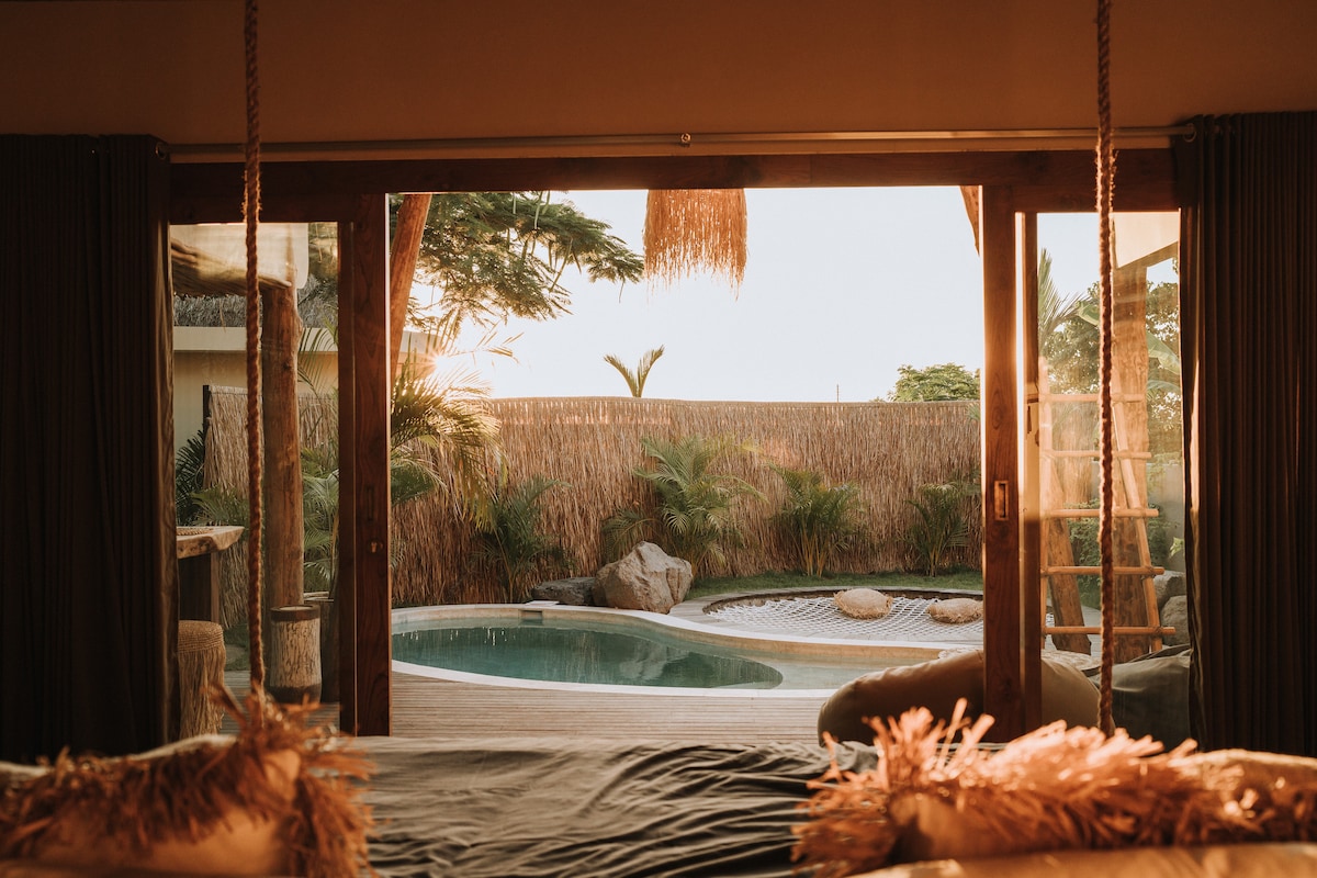 Agréement touristique PMA / KBLI 55900 Ecolodge de 2024 avec cuisine équipée et piscine privative dans un joli jardin. Avec sa toiture en alang - alang , sa salle de bain semie-ouverte , sa kitchenette independante, sa piscine et son filet de repos, le lodge offre des espaces ouverts sur le jardin tropical en toute privacy avec une decoration boheme qui vous plongera de suite dans lesprit de Bali. Situé à 5mn de Bingin Beach, Dreamland et Uluwatu center. Petit déjeuner a la carte inclus 👍
