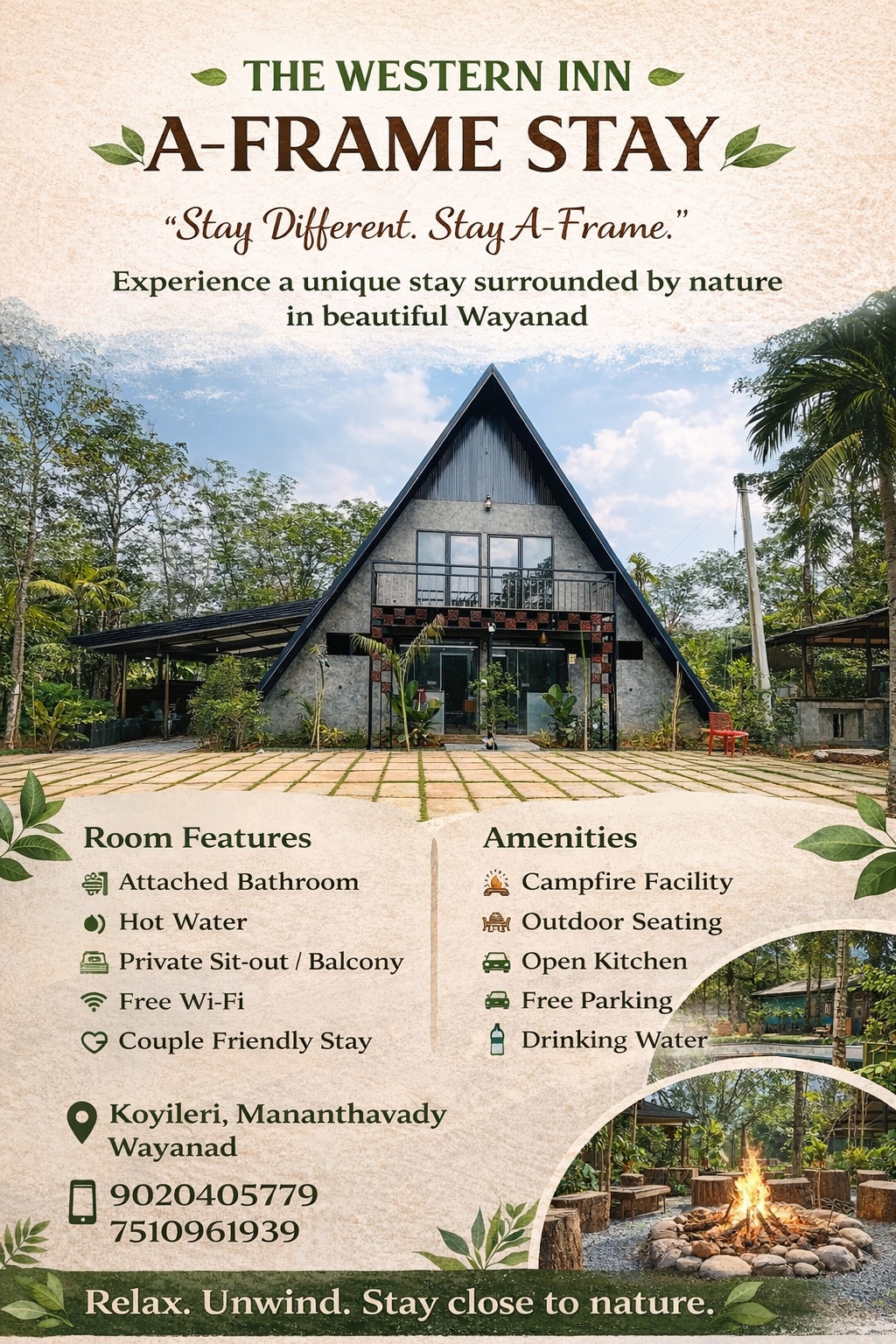 Relax with your family at our peaceful European-style 2-bedroom villa in Mananthavady, Wayanad. Surrounded by greenery and scenic views, it’s perfect for a relaxing getaway. Located near Muneeswaran Kunnu View Point and Komachi Park, with Adai Check Dam and river just 5 km away. The villa offers private parking, campfire setup, and BBQ facilities, ideal for families and small groups seeking comfort, privacy, and nature.