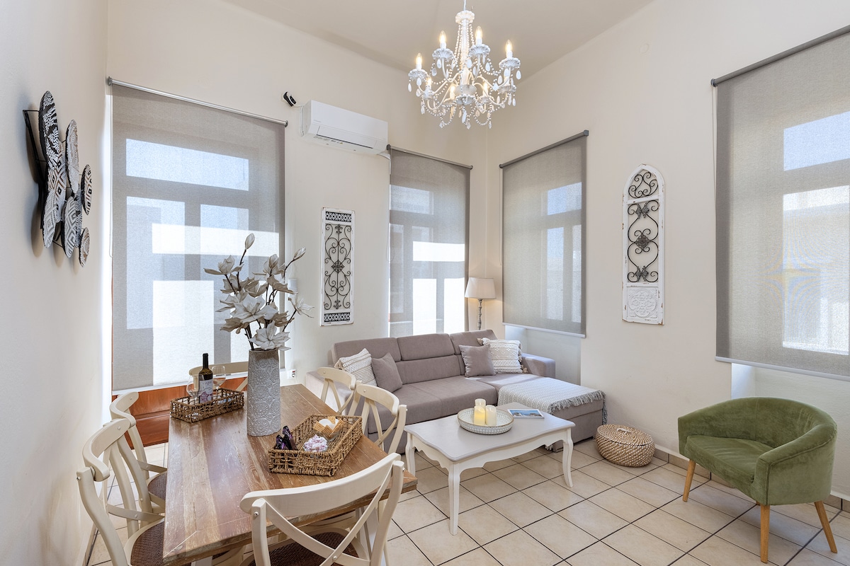 Newly renovated 80m² apartment, just 150m from Miaouli Square and 200m from the sea. It offers a double bed, a single/double bed, and a sofa bed for up to 5 guests. Includes a full kitchen, dining area, and living area with a smart TV, desk, and air conditioning. A spacious, comfortable space close to shops, cafés, and the beach—perfect for a relaxing stay in Syros.