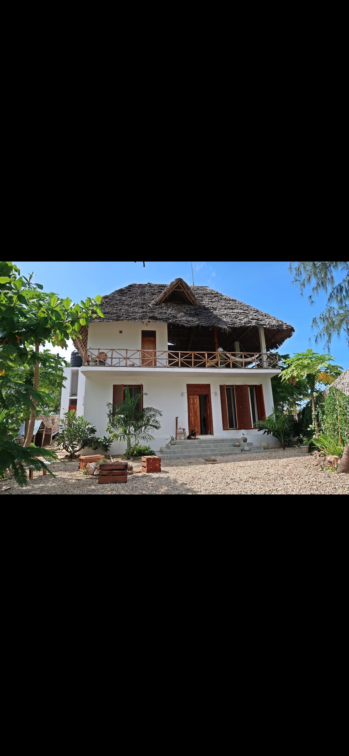 We have beautiful a house in Bwejuu . The House is in the first line , we have private pool . In addition, there are 3 large swimming pools and a restaurant The house is big: 2 bedrooms 2 bathrooms 3 toilletes Living room and kitchen (The kitchen is equipped with an oven, fridge,dishes,cutlery, blender, etc 2 Terraces AC Generator ( when the generator is running you have water, light, refrigerator, ceiling fans and a fridge,wi fi and charging socket) . African style deco is in the house