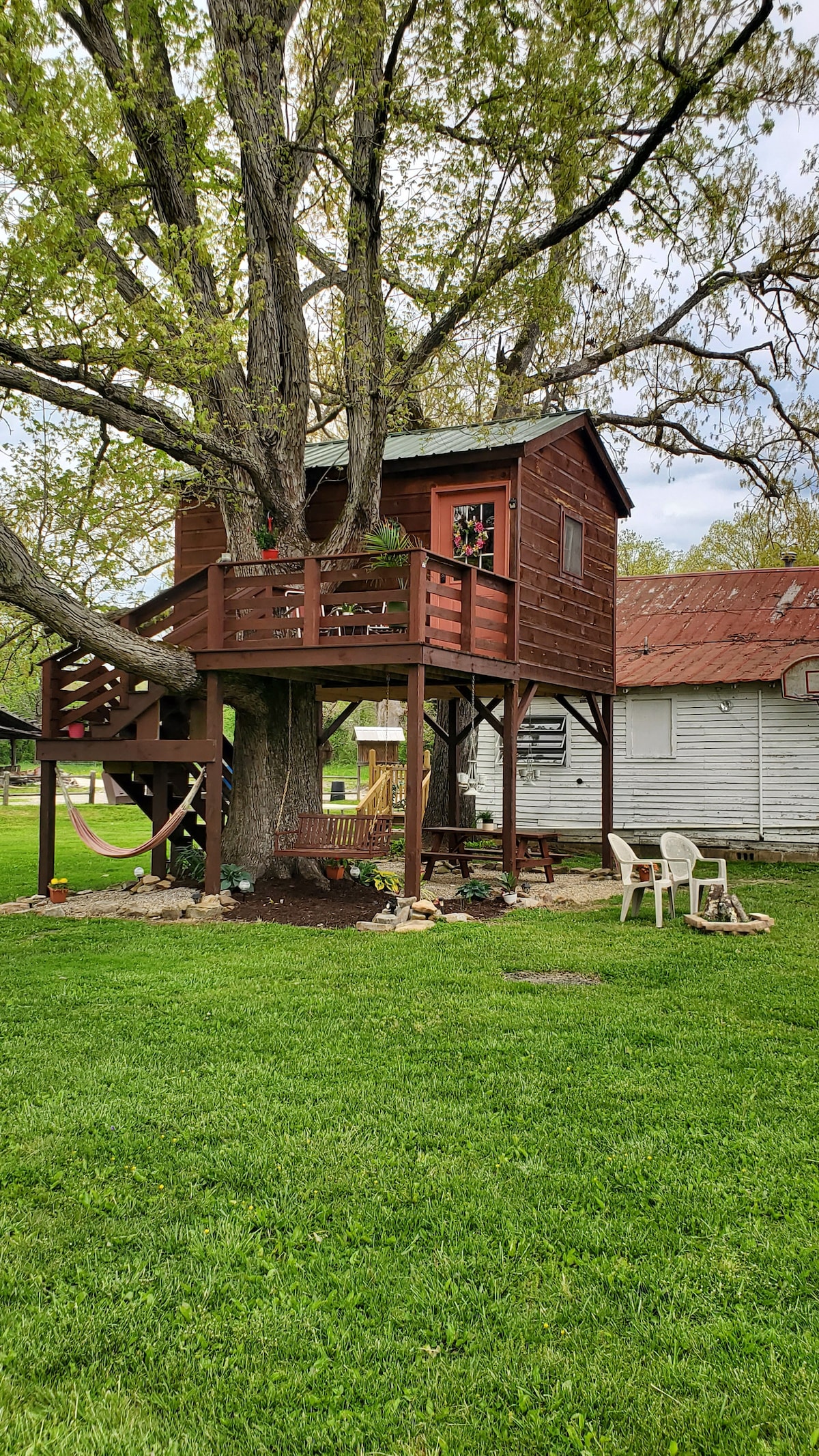 Esta pequeña casa del árbol es primitiva, sin electricidad ni agua, pero tiene una casa de baños cerca. Es una tienda de campaña en una casa del árbol. Situado detrás de la histórica tienda R.M. Brooks, es el lugar perfecto para encontrar paz y belleza. Perfecto para excursionistas. Descansa en las enormes ramas de este roble de casi 100 años. Una cama tamaño queen te espera para que pases una noche de sueño reparador. Debajo puedes hacer un pícnic en la mesa o columpiarte en el columpio que cuelga debajo. Este es el lugar perfecto para desconectar.