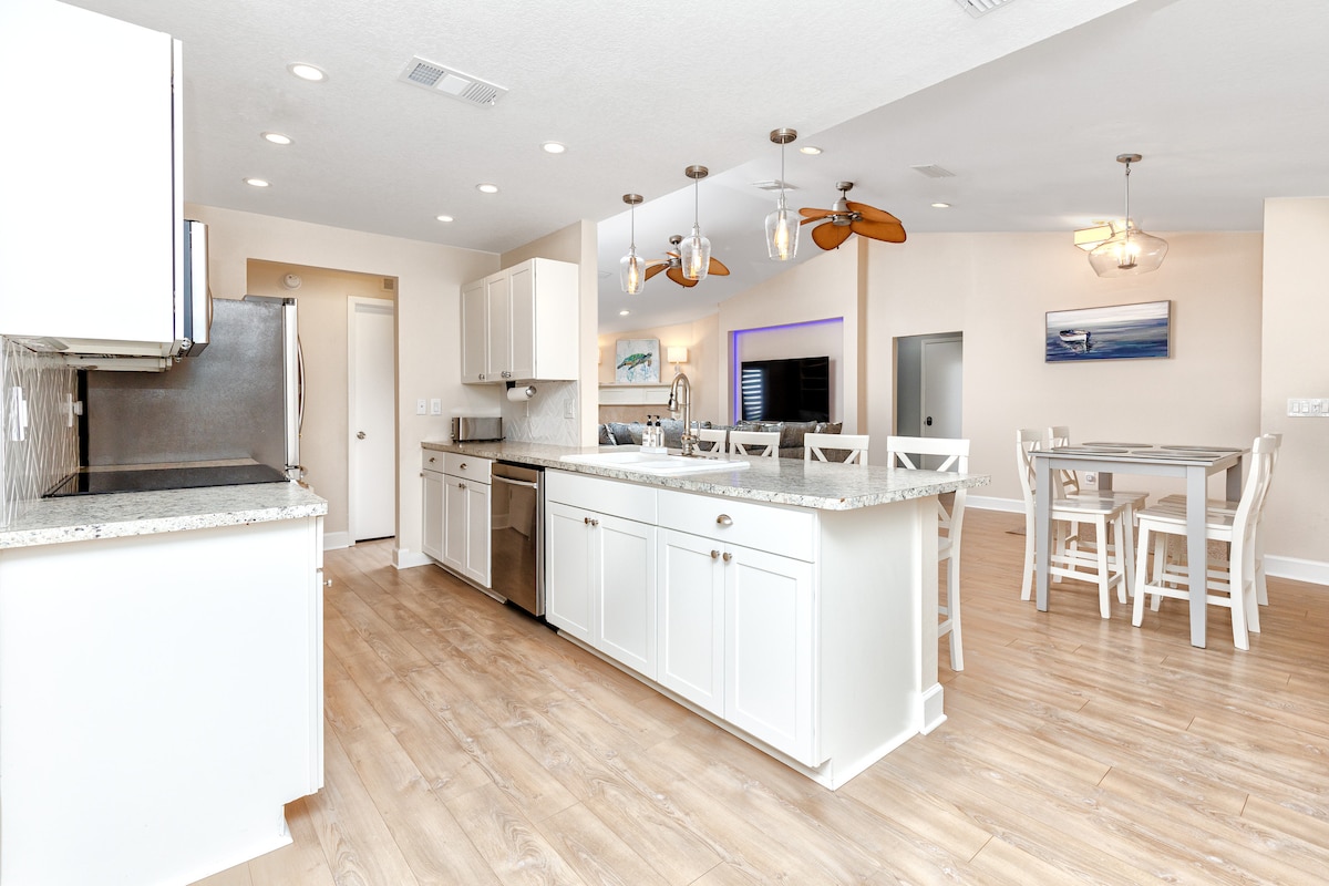 Dicen que las mejores cosas vienen en paquetes pequeños. Bueno, eso ciertamente suena verdadero en este caso. Nuestra casa puede ser pequeña, pero es grande en personalidad y llena de encanto elegante. Recién remodelado y lleno de toques personales, este pequeño paquete está listo para ser tu refugio en Florida. Disfruta del encantador puerto de palmeras en nuestro carrito de golf por una pequeña tarifa de alquiler.
