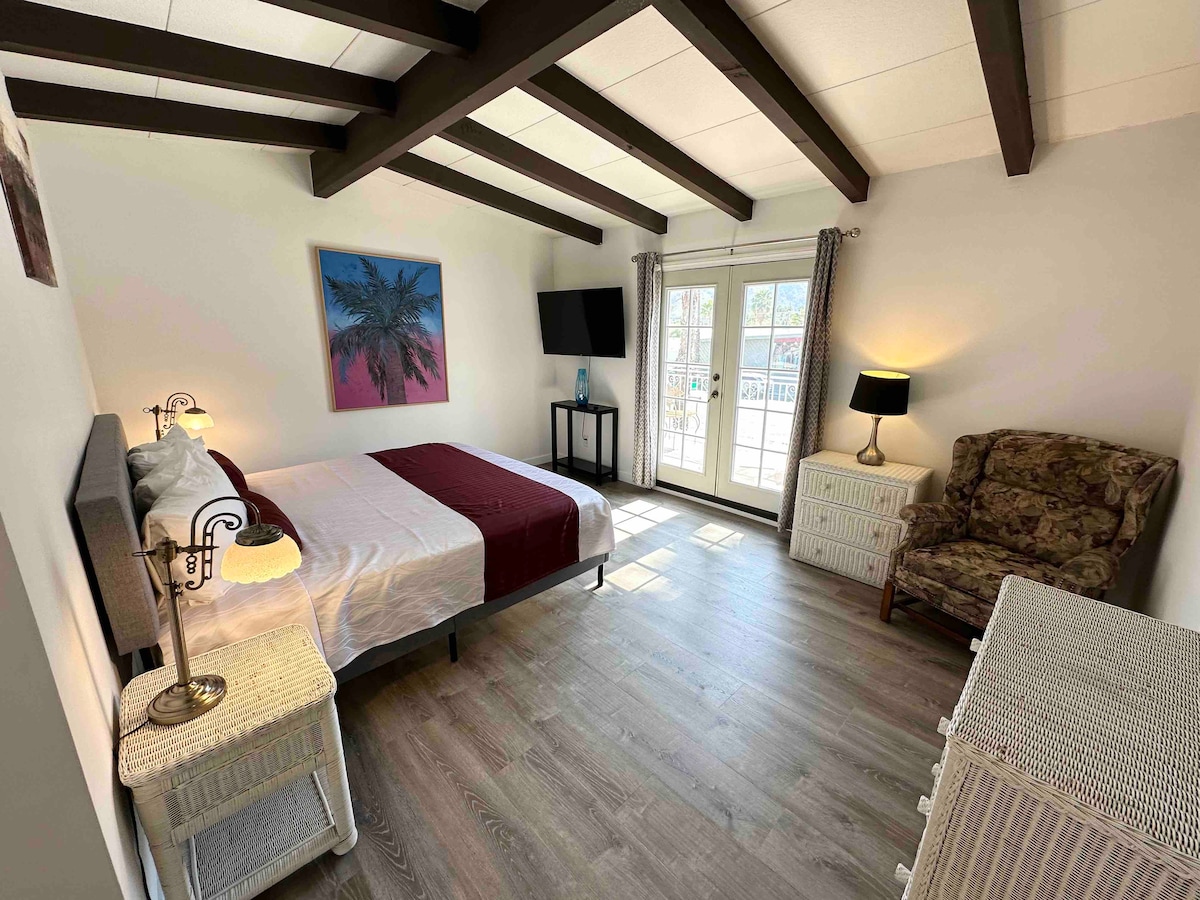 Recently remodeled, our Deluxe King room features a comfortable king-size bed, a modern bathroom with a walk-in shower and a large smart TV. Take advantage of the in-room coffee, and full kitchen available for your convenience. Step outside to your own private patio and immerse yourself in solitude and relaxation. The City of Palm Springs ID #2567
