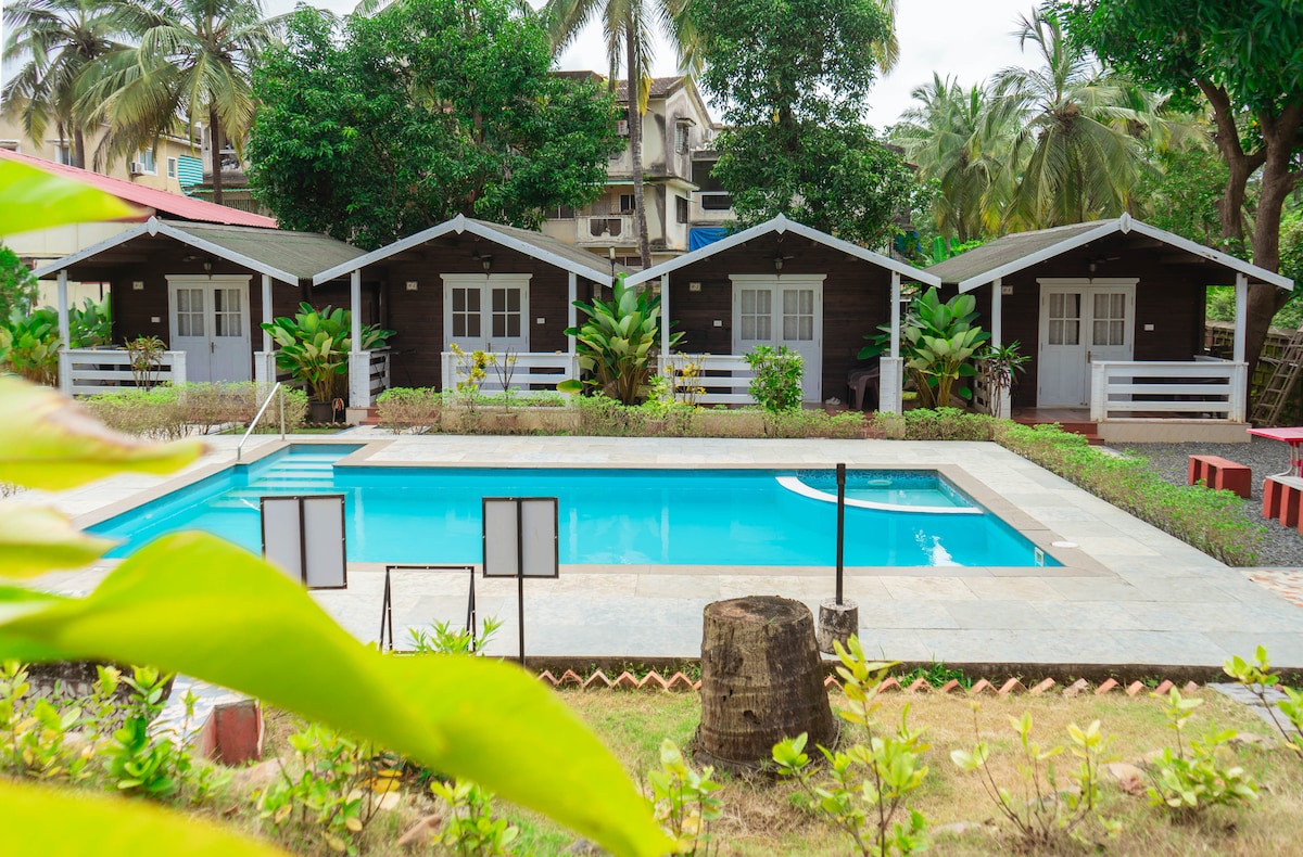 Una encantadora casa de madera escondida en JNB Orchards, a solo 5 minutos de la playa de Colva. Con aire acondicionado, baño privado e interiores acogedores, está hecha para relajarse fácilmente. Sal a un jardín ajardinado y a una refrescante, donde las mañanas son tranquilas y las noches se sienten mágicas. Con una ubicación céntrica pero tranquila, esta es tu escapada perfecta al sur de Goa.