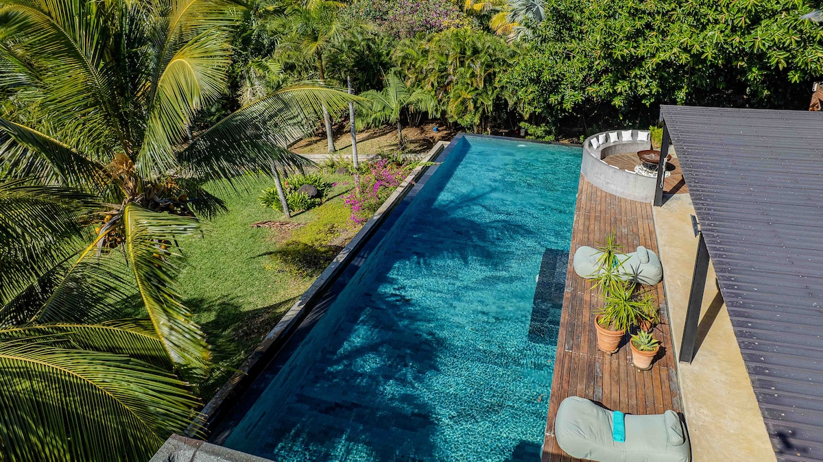 Magnifique villa tropicale de 450 m² avec grande piscine infinity de 19 m, surplombant un jardin privé arboré de 3000 m². À moins de 10 minutes du centre de Grand Baie, elle offre un accès rapide aux plages du Nord et au golf de Mont Choisy. Située dans un quartier résidentiel prestigieux de grandes propriétés à l'orée d'une forêt, elle offre calme et sécurité car elle est voisine de la résidence officielle de l’Ambassadeur de l’UE. Ménage quotidien assuré par une « Nénène » gouvernante