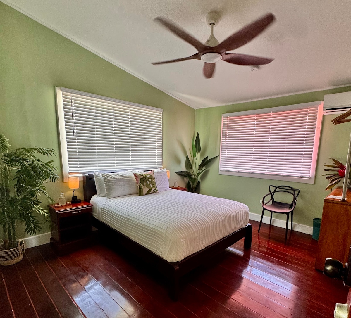 Bright, airy room with queen-sized bed, A/C, ceiling fan, hot water, and stunning ocean views. Your private door opens to a shared hall with an overwater deck for morning coffee or sunset views. The room and private bathroom sit above our social bar, restaurant, and garden, offering cocktails and Indian food just steps from the sea. Swim off the dock or stroll to downtown Bocas for surf, shops, and restaurants. Spacious, comfortable, and ideal for couples or individuals. Max guests: 2.