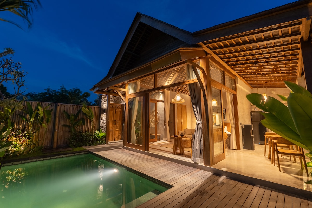 Villa tropical nueva en el corazón de Canggu • 2 elegantes habitaciones con aire acondicionado y vistas a la selva • Baños en suite con comodidades, pantuflas y secadores de pelo • Gran piscina rodeada de vegetación para descansar y hacer barbacoas • Diseño elegante y minimalista con cocina y comedor de planta abierta • Wifi de 300 Mbps para trabajar o transmitir • PS5, Netflix a petición • Cuna y trona bajo petición • Limpieza diaria con toallas y sábanas frescas • Servicio de conserjería para reservas de spa, escúteres, clases de surf y más