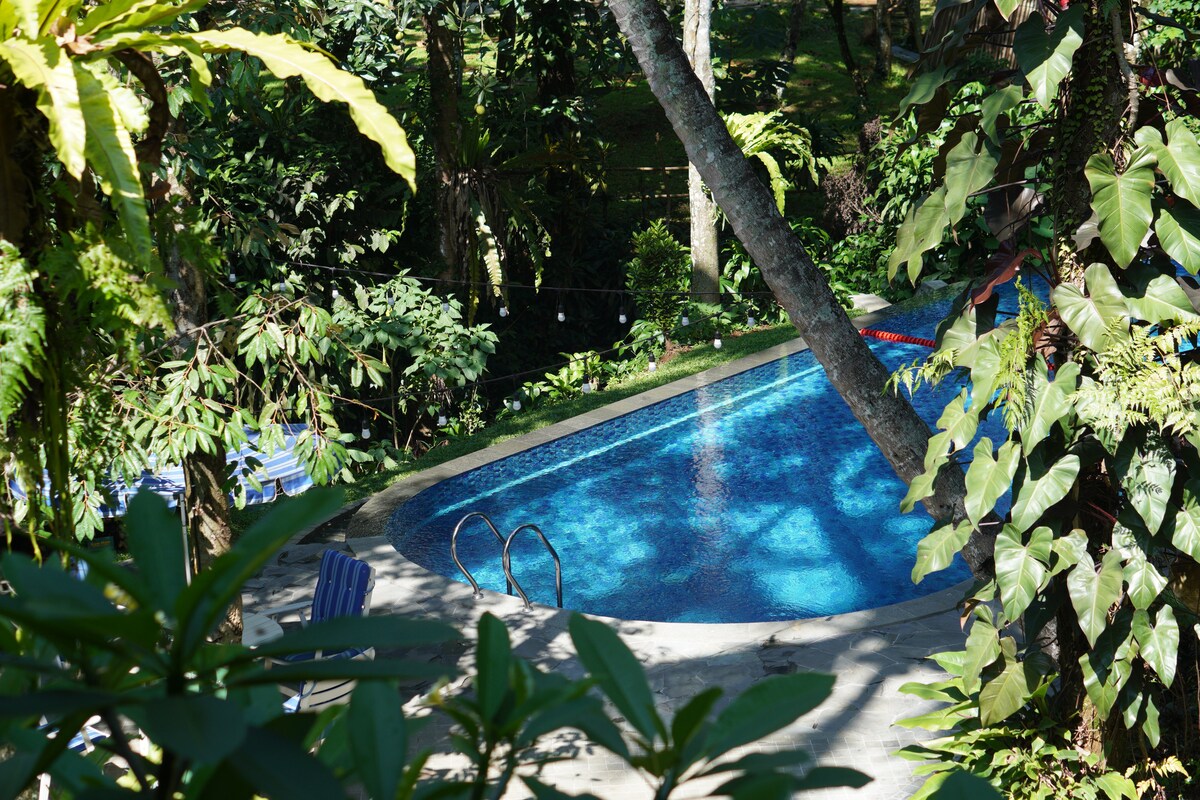 EL LUGAR: despertar en un bungalow con el canto de los pájaros, el sol entra por las ventanas y el aroma del campo. Las espléndidas vistas de la montaña son entornos de un paisaje único (rodeado de árboles de hoja perenne y plantas con flores) que se pueden disfrutar desde las ventanas o desde los espacios exteriores privados de la villa, sentados cómodamente tomando tus bebidas favoritas o inmerso en la lectura. Piscina privada @ 3mx6mx1.5m y el agua es de un manantial ubicado en las instalaciones.