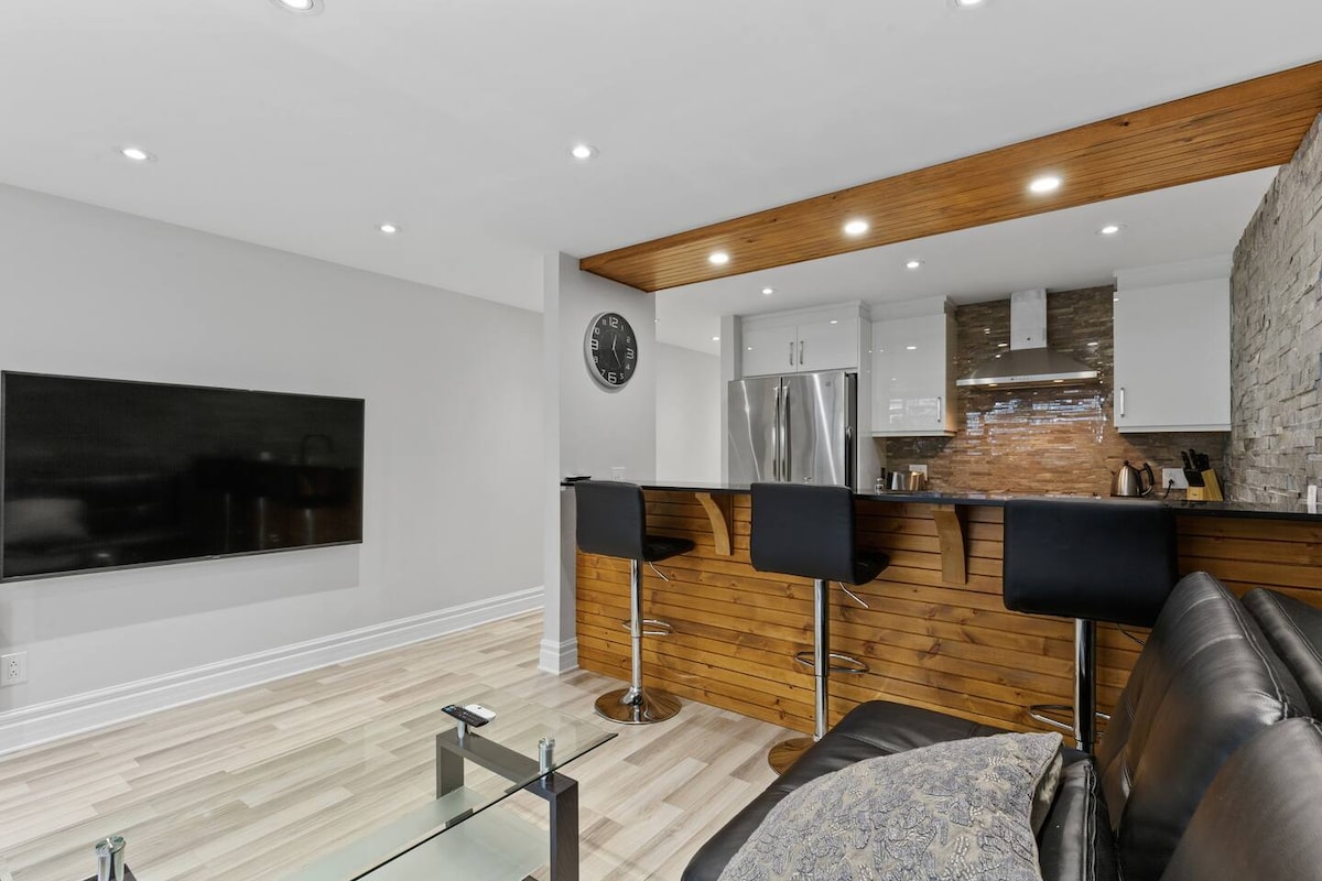 Perfecto para recién llegados y para explorar Montreal, a pocos minutos de 2 estaciones de metro (línea naranja) situadas en el centro cerca del mercado Jean-Talon, con acceso cercano a todas las carreteras y autopistas principales. Este nuevo y elegante alojamiento incluye un dormitorio grande, una cocina totalmente equipada con una nevera grande y máquina de hielo, lavavajillas, horno, microondas y estufa de gas, un bar iluminado, iluminación regulable, aire acondicionado, un televisor 4K de 60 pulgadas, vajilla, ropa de cama, una cocina de concepto abierto/sala de estar con bar, suelos de baño con calefacción y una gran terraza trasera.