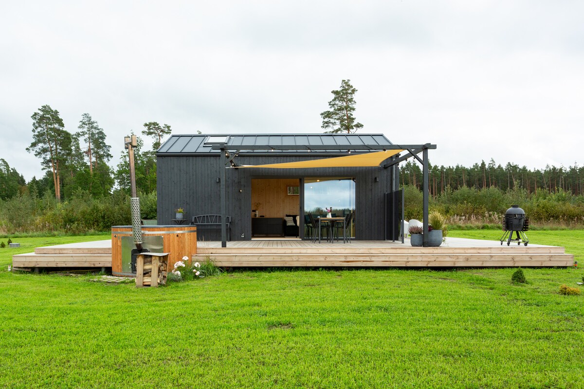 A freshly renewed tiny house on the banks of the Sauga River is waiting for you! Private, cozy, and blue – it has everything you need for a relaxing getaway or a practical stopover: -Comfortable tinyspace for up to 4 guests -Kitchen, shower, and a fireplace -Parking for multiple cars -Dog-friendly!