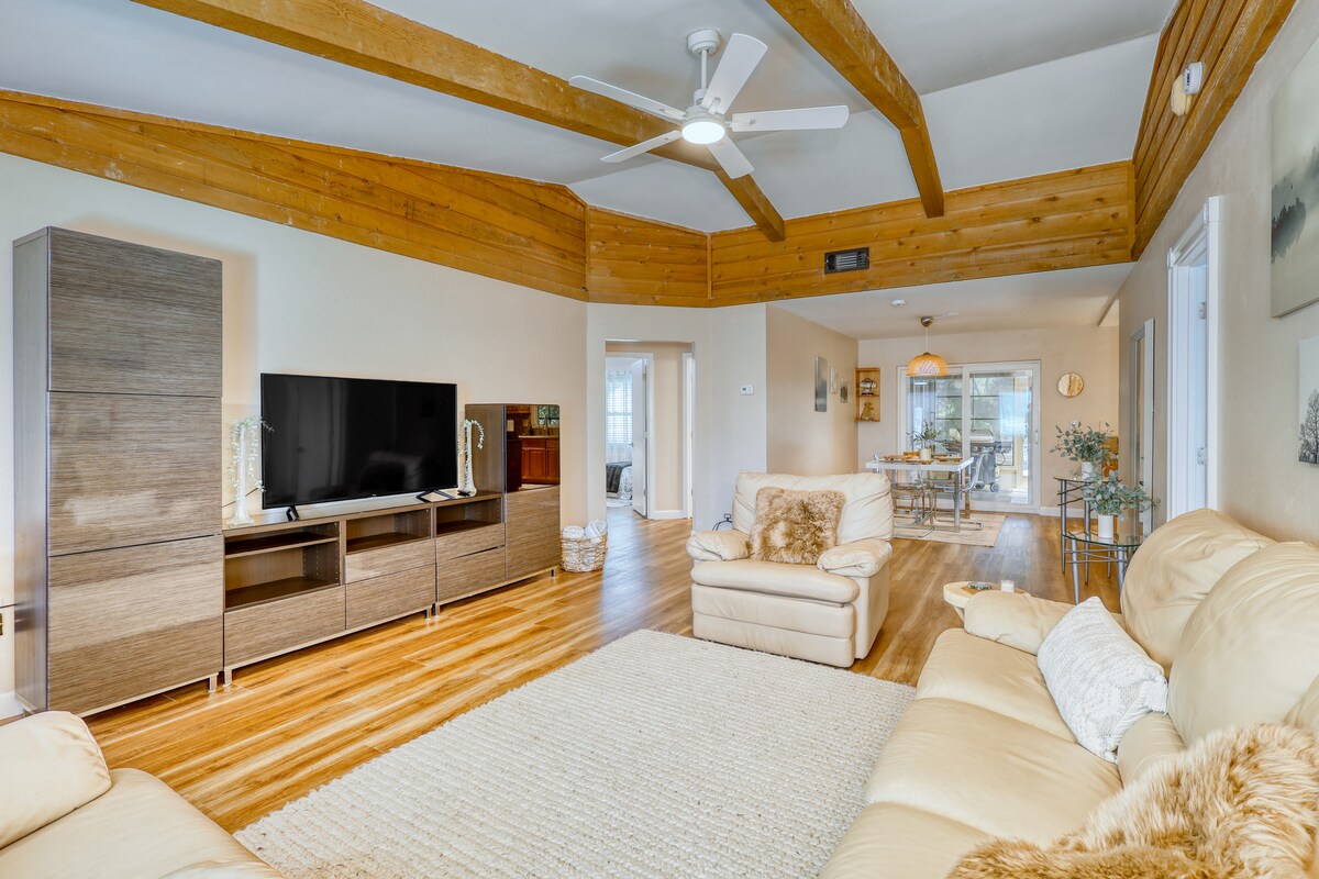 ¡Vive la vida del lago! Contempla la puesta de sol sobre el lago Huntley desde la ventana de tu cocina y la chimenea; explora el lago atracando tu embarcación (o alquila la nuestra) en tu patio trasero, o utiliza nuestro kayak tándem, canoa o SUP incluidos. Esta acogedora casa tiene 3 dormitorios, 2 baños y capacidad para 9 personas cómodamente. Disfruta de mucho espacio para vivir, un gran porche cerrado, cocina completa, chimenea y parrillas para barbacoa. La casa también incluye lavandería, cargador de vehículos eléctricos, conexión para vehículos recreativos y estacionamiento. ¡Cocina completamente renovada en 2024!