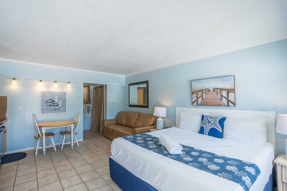 Suite Deluxe con cama tamaño king (disponible a largo plazo): suite completa con cocina pequeña y comedor. La habitación está equipada con Wifi de ultra alta velocidad y Roku. A poca distancia a pie de Philippe Park, el puerto deportivo de seguridad y el centro de la ciudad. Usted puede disfrutar de largos paseos diarios a la naturaleza, la pesca y el kayak. Philippe Park es una morada de delfines, manatíes, caimanes, águilas, búhos y águilas pescadoras. Estacione su autocaravana o barco de tamaño grande fácilmente de forma gratuita. Buscar Marbay motel puerto de seguridad en Internet para la reserva directa.