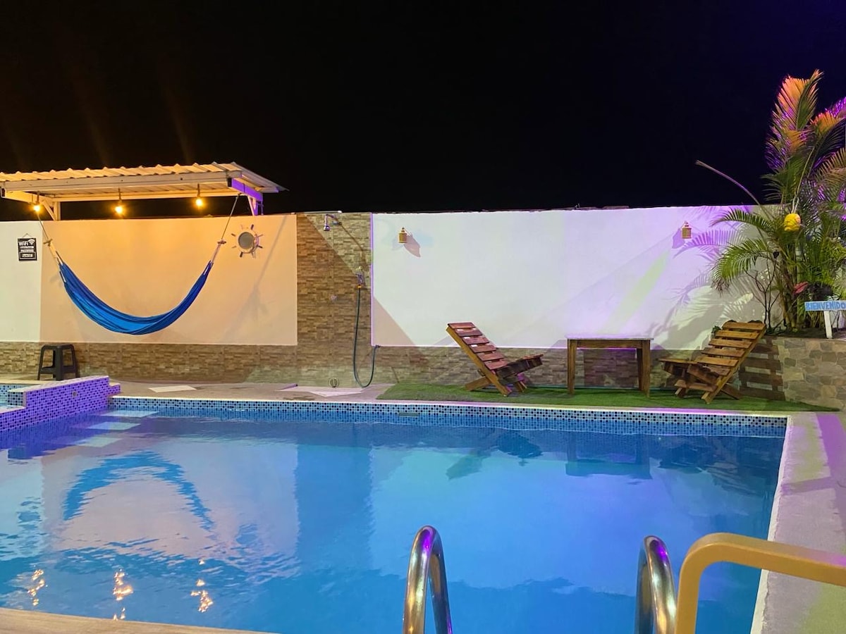 Este moderno lugar te ofrece muchos detalles encantadores.Para garantizar tu estadía gunto a tu familia, te ofrecemos un excelente descanso y contamos con piscina-hidromasaje-sauna-parqueadero-área para asados -wifi y guardiania tenemos varias habitaciones matrimoniales, dobles y triples con aire acondicionado y cn ventilador también contamos con hamacas, muebles para que te reúnas a conversar con los tuyos visitamos te esperamos ..pd aceptamos a tu mascotas