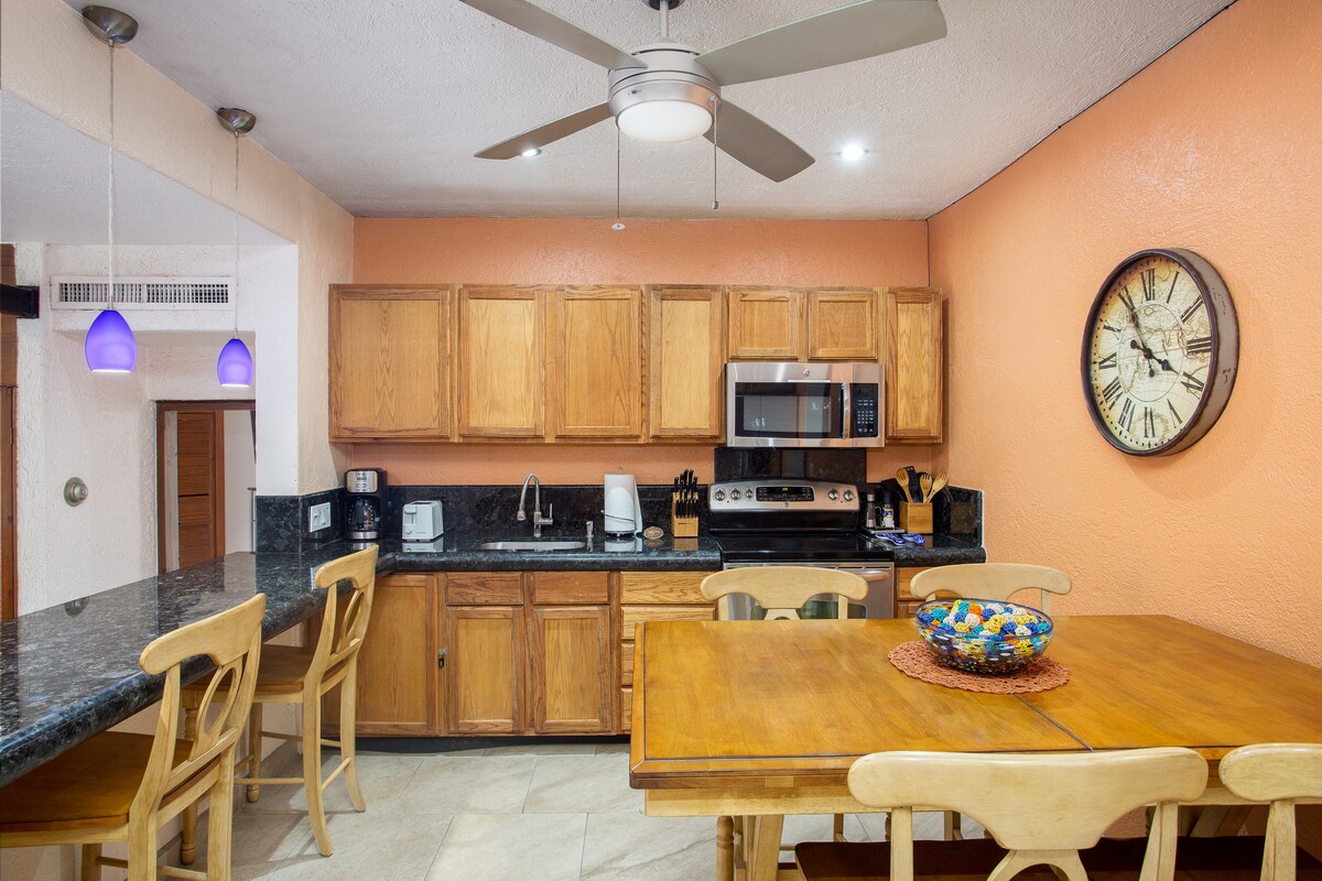 Welcome to our Beautiful penthouse condo, your Casa in Cabo! . Enjoy the pool and courtyard views from private balcony with BBQ. Living (smart tv) and dining areas great for entertaining. Fully equipped kitchen. 16 ft vaulted ceilings. MBR: full bathroom, one king size bed and one full size bed, smart tv. SBR: Two twin beds, arranged as a king size if needed, full bathroom. Laundry area. Condo perfect for couples, friends, and families..Mi Casa su Casa!