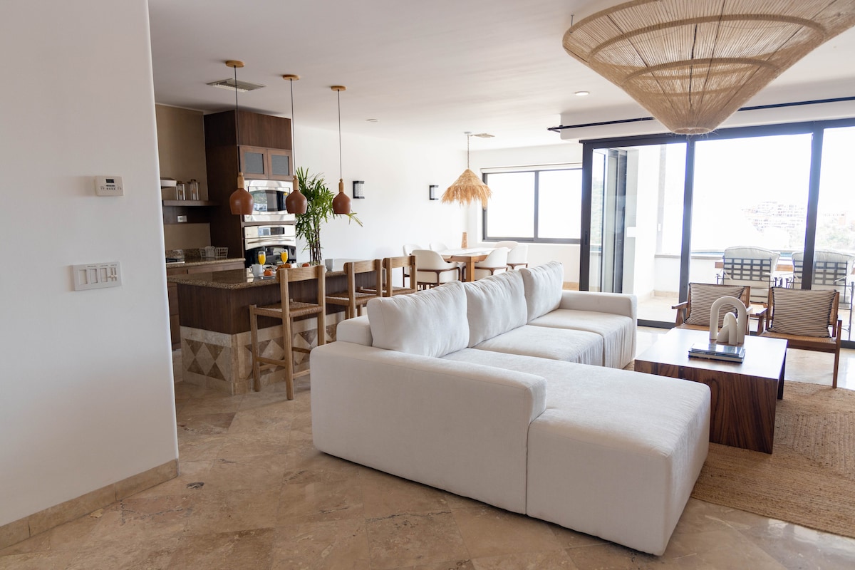 ¡Bienvenido a nuestro impresionante apartamento con vistas incomparables del icónico Arco de Cabo San Lucas! Ubicado en una ubicación verdaderamente única en el corazón de la ciudad, nuestro lujoso refugio ofrece una combinación perfecta de comodidad, estilo y conveniencia. Te cautivarán las vistas panorámicas del Arco y las aguas azules del Océano Pacífico desde la amplia sala de estar. El apartamento cuenta con una decoración de buen gusto y contemporánea, con muebles elegantes que añaden un toque de sofisticación a cada rincón.