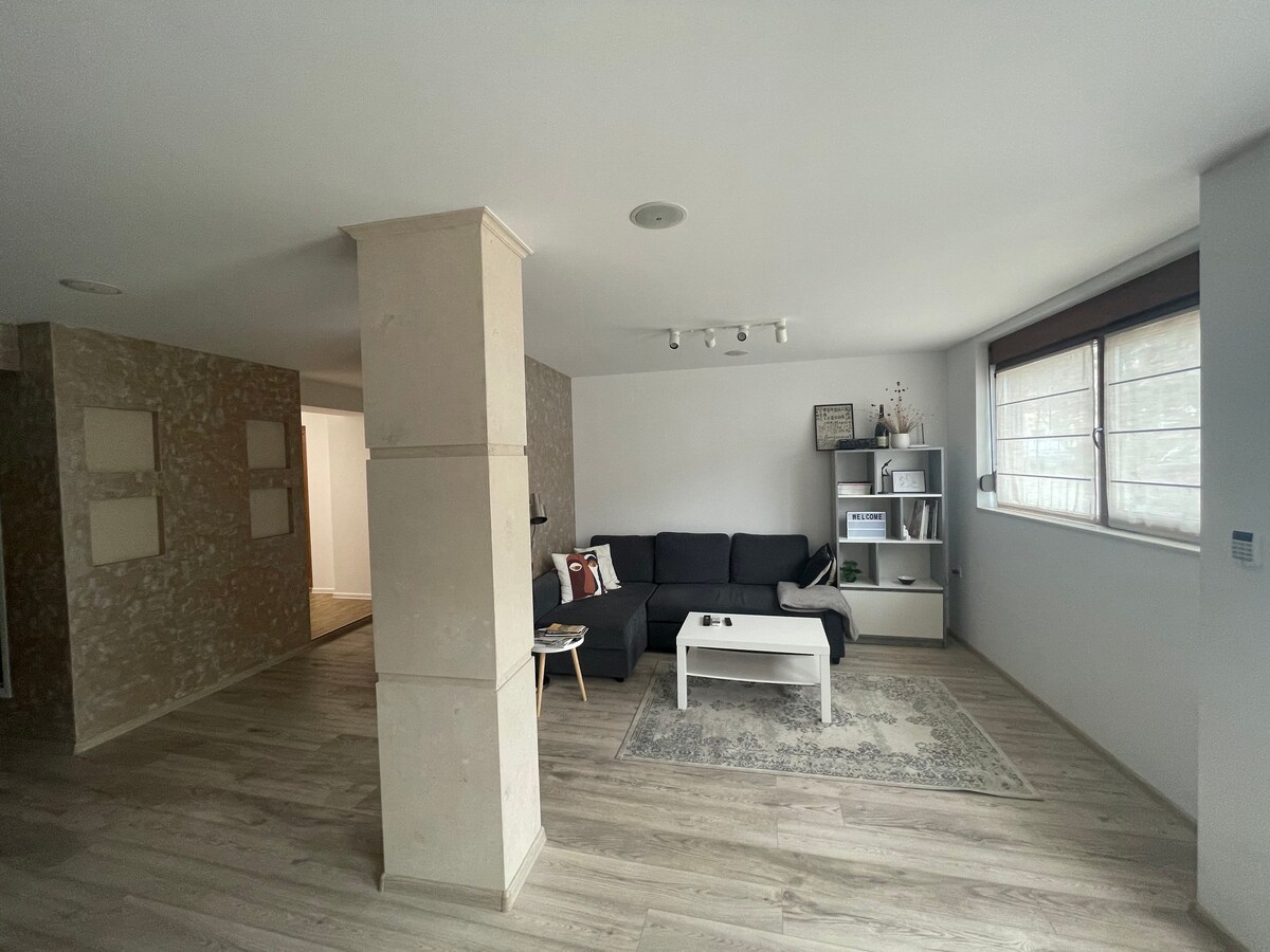 Просторен апартамент в широкия център на града.Съвсем близо до магазин Лидел, както и до Университетите в града. Апартаментът разполага с две спални с легла (144/190 и 120/190), всекидневна с разтегателен диван и оборудвана кухня с голяма маса, комфортна баня, както и тераса от всяко помещение с прекрасна гледка! В апартамента има и пералня. На 10 мин. пеша е от идеалния център. Зад и сградата има безплатно пространство за паркиране, пред сградата паркирането е платено през седмицата! :)