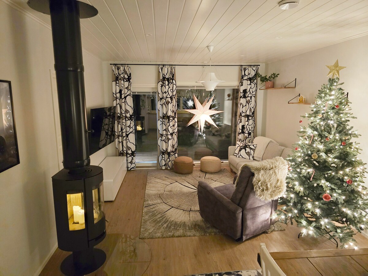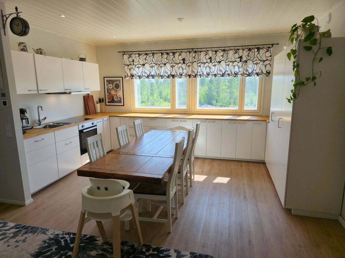 ¡Le damos la bienvenida a esta casa única de Laponia! Haremos que su estancia sea agradable y cómoda: contamos con aire acondicionado, un baño moderno con sauna y dos duchas, dos inodoros, calefacción por suelo radiante, una cocina de concepto abierto, grandes ventanales desde el suelo hasta el techo y 4 dormitorios. También puede usar nuestro gimnasio de forma gratuita. La casa se encuentra en un pequeño pueblo cerca de un hermoso bosque.