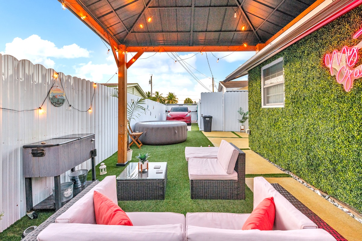 Este increíble minicentro vacacional ha sido creado pensando en la máxima comodidad de nuestros huéspedes. Disfruta de un patio y una terraza para la piscina diseñados con muchos asientos al aire libre y una cabaña tiki. La propiedad tiene césped sintético en todas partes, perfecto para que los niños y la familia se sienten y jueguen. Wifi superrápido. Puertos USB en el dormitorio. Cama supercómoda. Televisor inteligente en el que puedes transmitir tus películas favoritas. Combo lavadora/secadora. Barbacoa al aire libre. Nuestro alojamiento se encuentra a minutos del centro de la ciudad y de la playa/paseo marítimo de Hollywood.