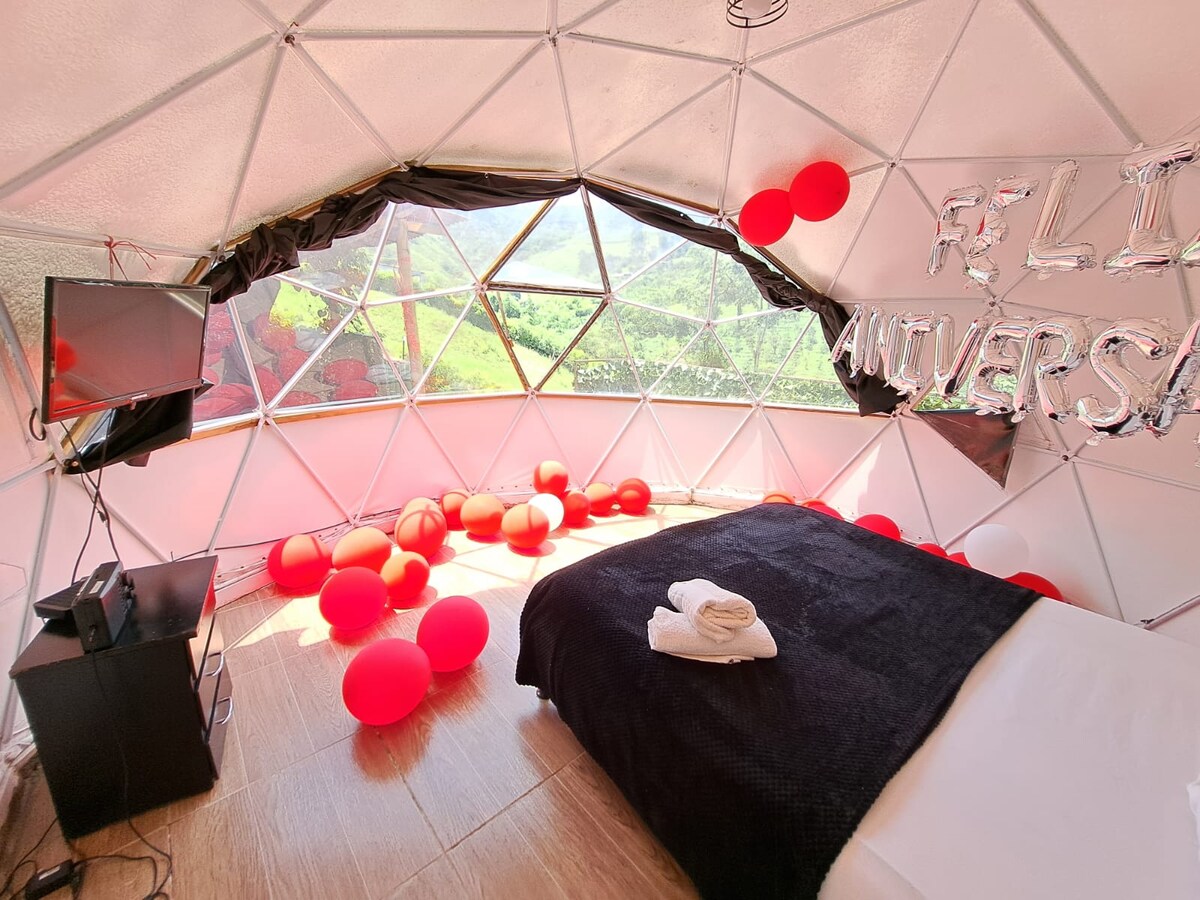 Escápate con tu pareja a este acogedor domo entre Filandia y Quimbaya. Ideal para una experiencia única, rodeado de naturaleza y con acceso rápido a los principales destinos del Quindío. Relájate en la malla de catamaran y disfruta de un delicioso desayuno incluido. Tranquilidad, comodidad y romanticismo en un solo lugar. ¡Perfecto para celebrar el amor! Ten en cuenta que la cabaña se encuentra a 9,6km del parque de Filandia, pero es muy fácil llegar en transporte público o vehículo particular.