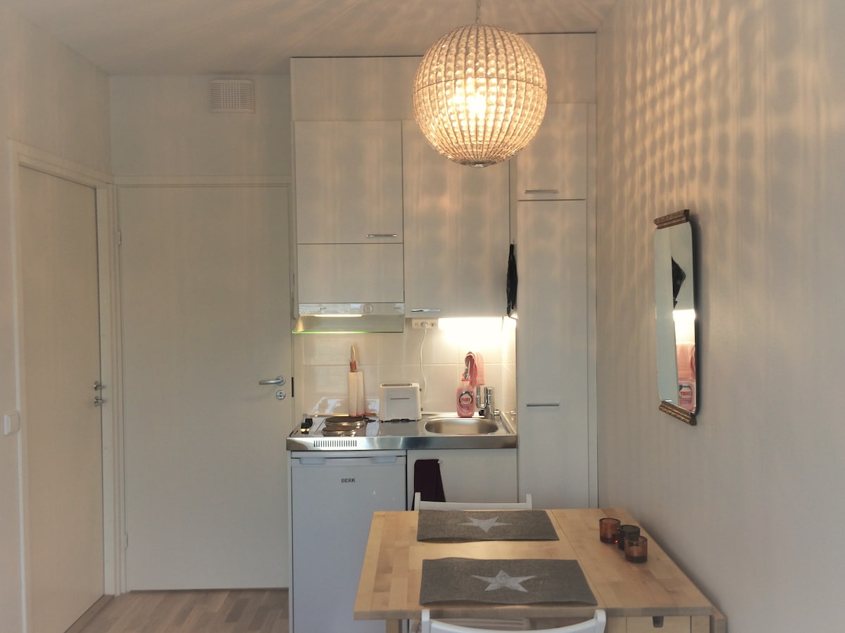 Acogedora habitación con baño, cocina americana y balcón francés cerca del centro de la ciudad. Cama de 140 cm de ancho. Sábanas, toallas y utensilios de cocina. TV. Microondas, lavadora. En una bodega hay una sala de secado. Supermercado, estación de autobuses y estación de tren a poca distancia. Hay un estacionamiento gratuito a lo largo de Karhunkaatajantie. También puedes estacionar en el patio durante 3 horas con un disco de estacionamiento. Te enviaré instrucciones para la llegada autónoma una vez que hayas reservado. ¡Disfruta de Laponia!