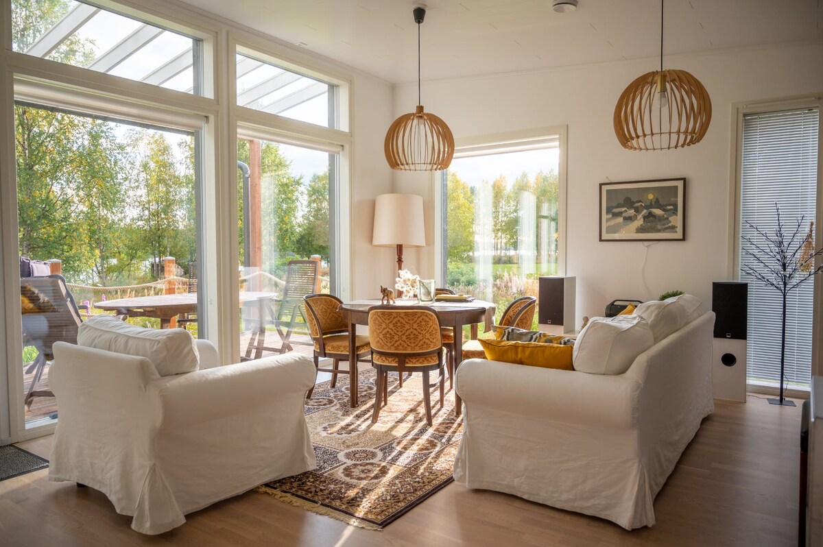 Una acogedora y tranquila casa junto al río Tornio, cerca del círculo polar ártico. Al otro lado del río verás Suecia. Disfruta de hermosas puestas de sol y, en las noches oscuras, de las auroras boreales justo afuera. Perfecto para una escapada relajante o una parada conveniente en su camino a Laponia o Noruega. Excelente pesca en verano. En invierno, la estación de esquí de Ritavaara está a 35 km y las pistas de Aavasaksa a 28 km. Distancias: Rovaniemi 130 km, Levi 180 km, Ylläs 135 km, Kemi 100 km.