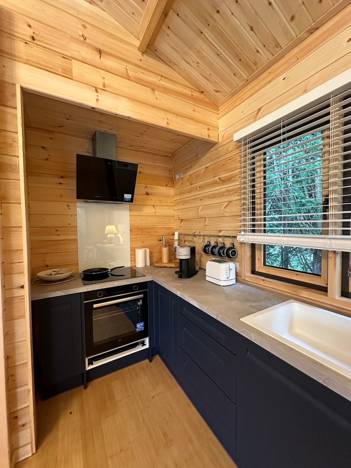 Forget your worries in this spacious and serene space. A new custom-built cottage with Air Conditioning, Oak furniture, a new Oak bed and kitchen, and a great bathroom. We finished building in June 2022, so be one of the first to enjoy it. It is an EPC A-rated eco-build. In a secluded orchard accessible by a country lane with minimal passing traffic, a tranquil, peaceful location. New hot tub Jan 2023, Sauna installed July 2023 We are pet friendly, but land is hedged not fenced.