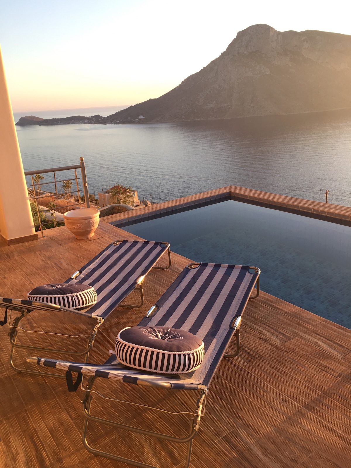Kastelli Blu Residences Greek Island luxury accommodation. Kastelli Blu is a beautiful Greek island holiday house for rent. A modern Greek villa recently renovated by an interior designer, this is one of Kalymnos' few absolute waterfront holiday houses available. A path to the sun-bleached rocks & water from the house, limestone mountains behind the house for the ultimate in privacy. The villa is ideally situated in the climbing belt and is located directly below several climbing sites.