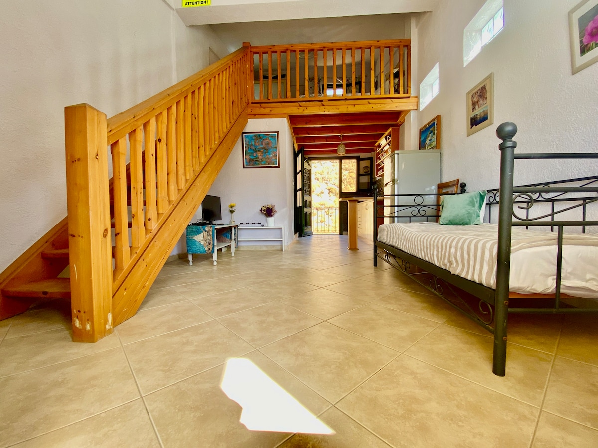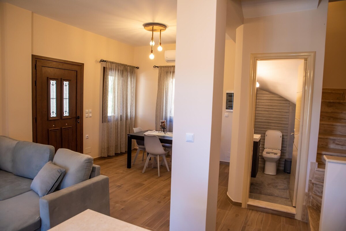 Seaside Apartment 1 is located in a prime location, just a three-minute walk from Emporios beach, with a sea view from the balcony. Situated on the first floor, it features a beautiful loft with a large double bed, air conditioning, and storage spaces. In the open-plan area, there is also a sofa bed that can accommodate a third person. The kitchen is fully equipped and the bathroom is modern and comfortable. The apartment also includes a television and a backyard with a mountain view.