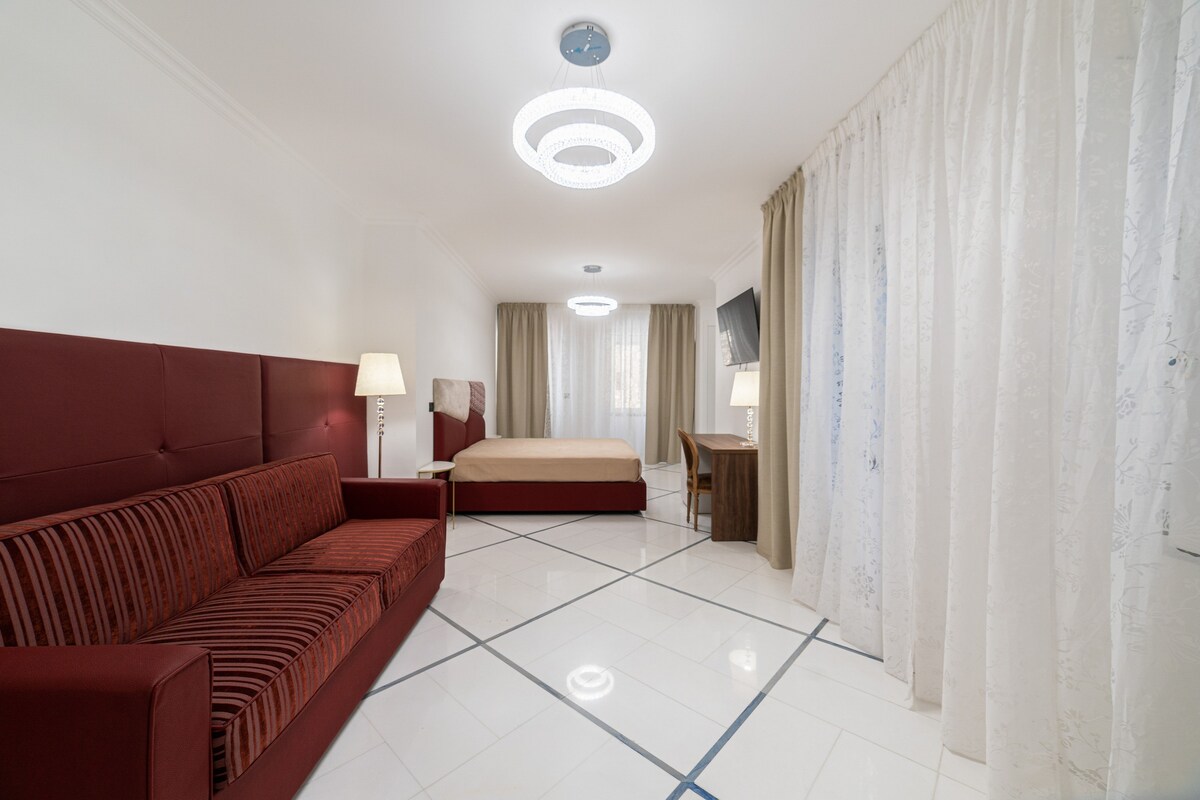 Nuestro Mini Apartamento Chiaia número 4 tiene un baño privado, un espacio de trabajo dedicado y ha sido amueblado con una cama Sommier Super King tamaño cm180x210x27 en espuma viscoelástica y ortopédica, además de un tamaño de sofá cama cm180x200x25 con una altura de colchón muy cómoda cm25