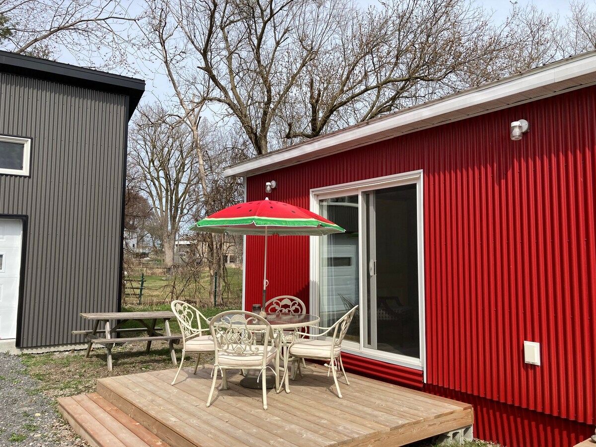 Prince Edward County, Picton ON. STA Lic# ST-2019-0028. Our tiny home (540 square feet) is totally yours, 1 bedroom, deck with tables and chairs, sunny west exposure. Industrial chic, bright, large lot, pet friendly, Wifi, full kitchen, living space, office area, smart TV and air conditioned. We supply a seasons Day use Pass to the Sandbanks Provincial park for you to book your day(s) at the beach. To guarantee entry, you can book your dates up to 5 days in advance.