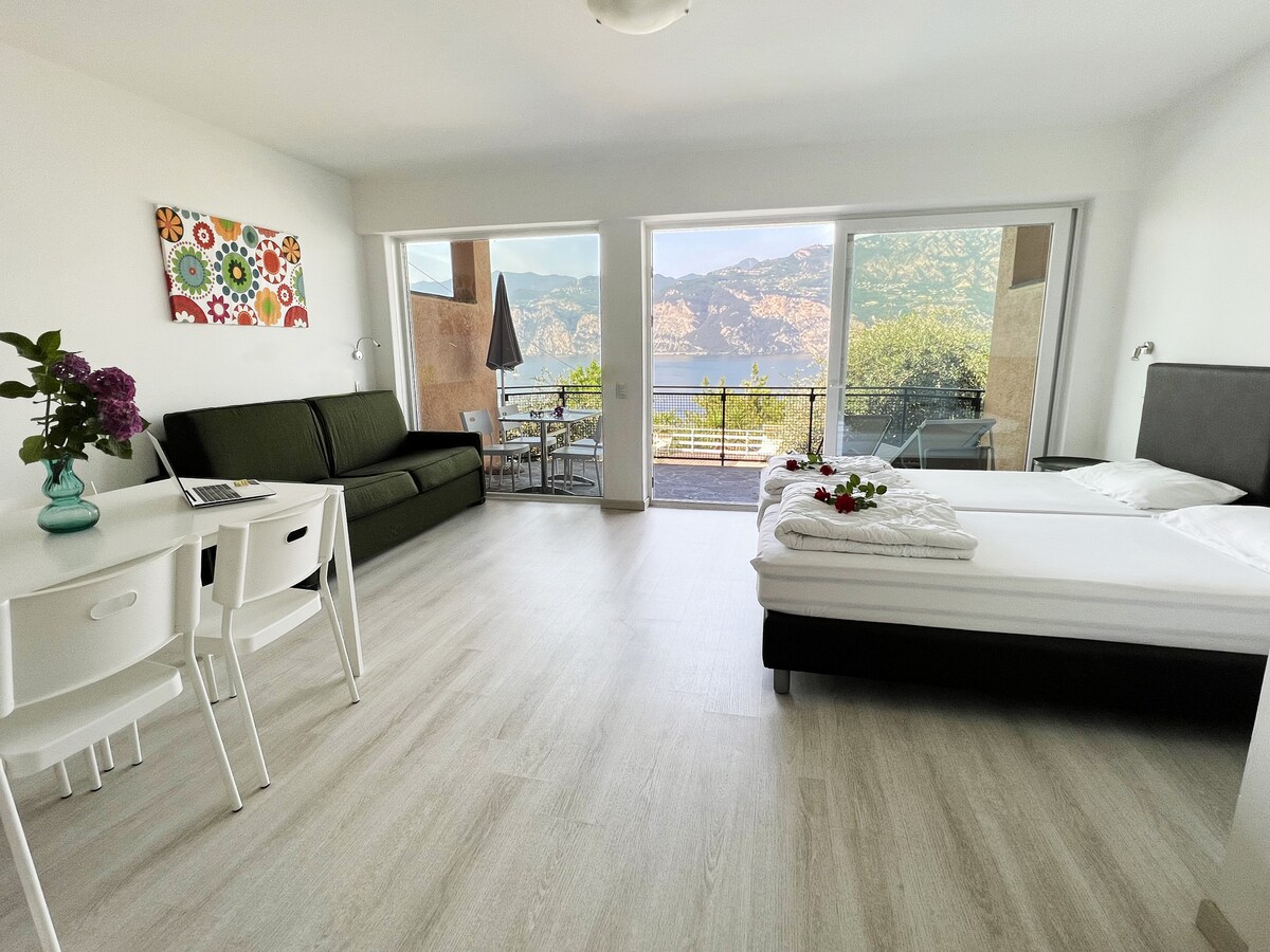 Despiértate en este elegante apartamento con impresionantes vistas del lago de Garda desde todas las ventanas. La fantástica terraza de la azotea ofrece la oportunidad perfecta para comenzar el día con un desayuno soleado, disfrutar de un baño de sol privado mientras ves pasar los barcos y terminar el día con una puesta de sol. Te sentirás como si estuvieras pasando tus vacaciones no solo en la orilla del agua, sino en el agua. Rodeado por el sonido de las olas, este tranquilo apartamento ofrece todo lo necesario para disfrutar al máximo de tu vida.