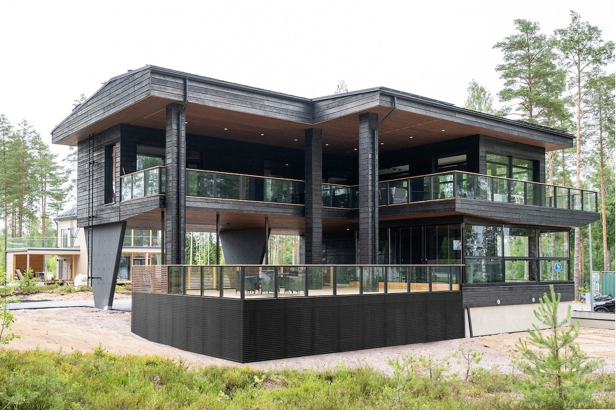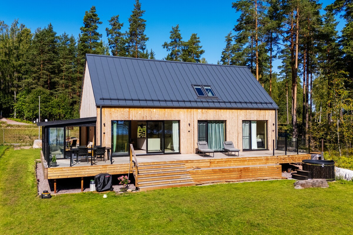 Pickala es una moderna propiedad de 3 dormitorios a menos de 35 minutos de Helsinki, que combina el diseño escandinavo y el mobiliario de alta calidad de Secto Design, Artek y Adea. Los techos de hasta 6 metros, las paredes de CLT y los suelos de hormigón crean un ambiente nórdico característico. Las grandes ventanas enmarcan las vistas del bosque y el mar, mientras que el invernadero de cristal, la bañera de hidromasaje y los interiores de diseño proporcionan un entorno relajante. Perfecto para familias o amigos que buscan un lugar cómodo para pasar tiempo de calidad juntos.