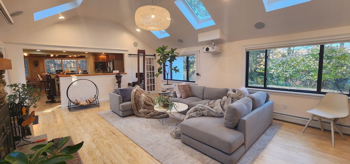 Esta joya arquitectónica con ventanas de vidrio envolventes da la bienvenida a los huéspedes con su interior informal de diseño único ubicado en 7 acres privados de bosque. Acurrúcate alrededor de la chimenea de leña con ventanales del suelo al techo como telón de fondo, o siéntate en la amplia terraza alrededor de la hoguera contemplando las estrellas. Utilízalo como base para las maravillosas actividades culturales y al aire libre de la zona, o disfruta de la naturaleza con lujo sin salir de casa. *Reserva entre semana para obtener tarifas con descuento. IG: @midcenturyoctagon
